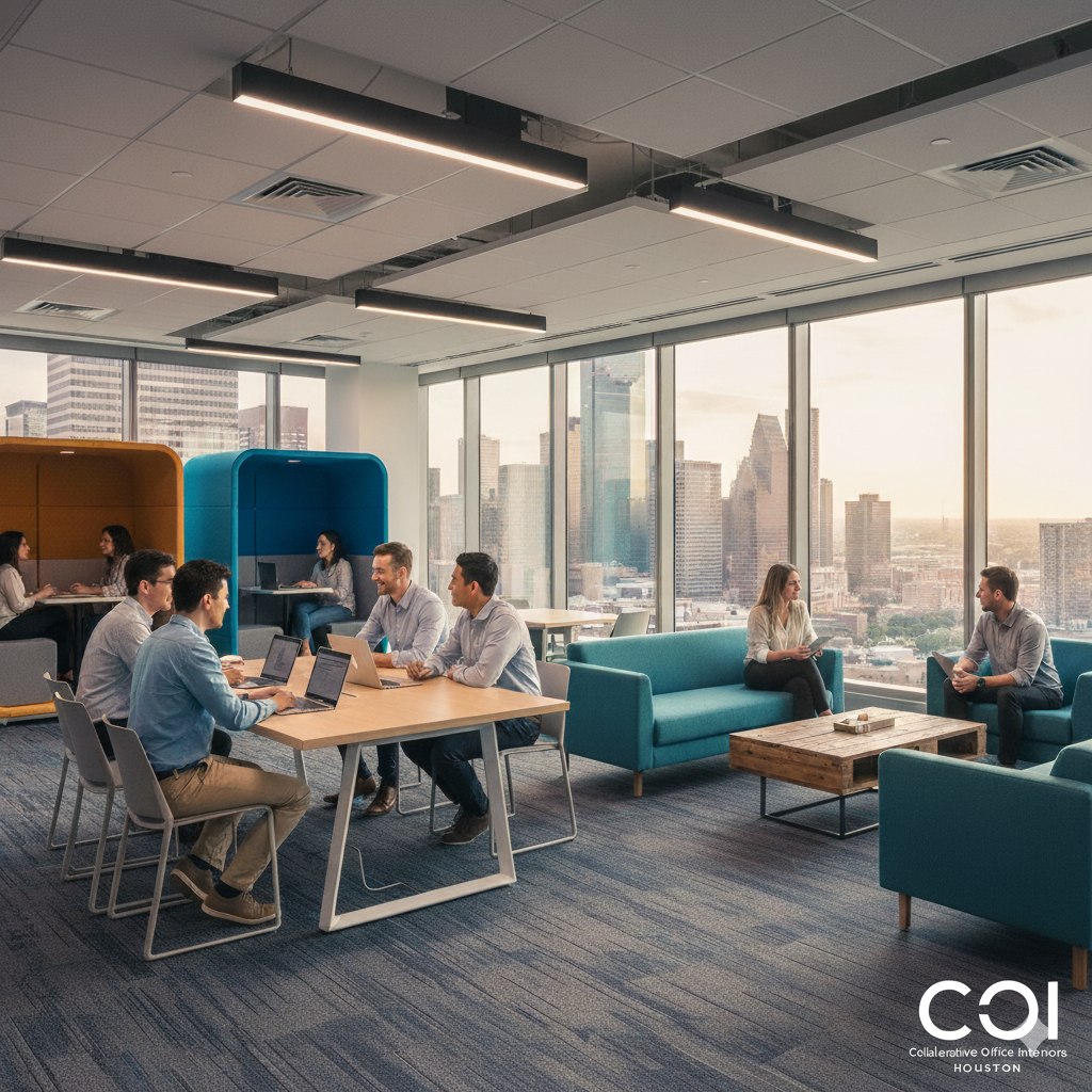 Collaborative workspace office furniture Houston includes modular desks, mobile whiteboards, lounge seating, and shared tables designed to support teamwork, flexibility, and communication in open or hybrid office environments.