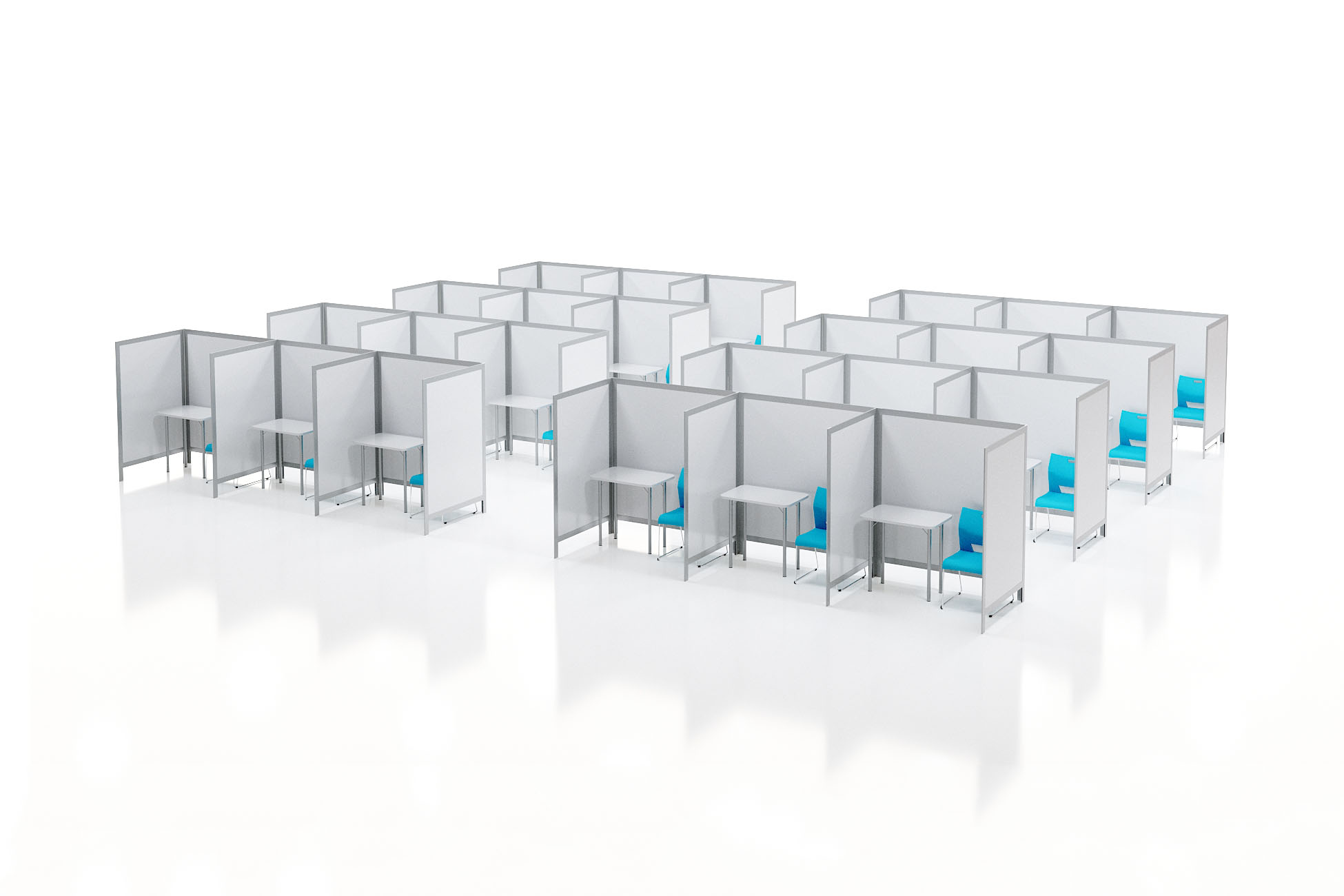 Various types of partitions, office cubicles, group and modular desks for shared spaces and team collaboration.
