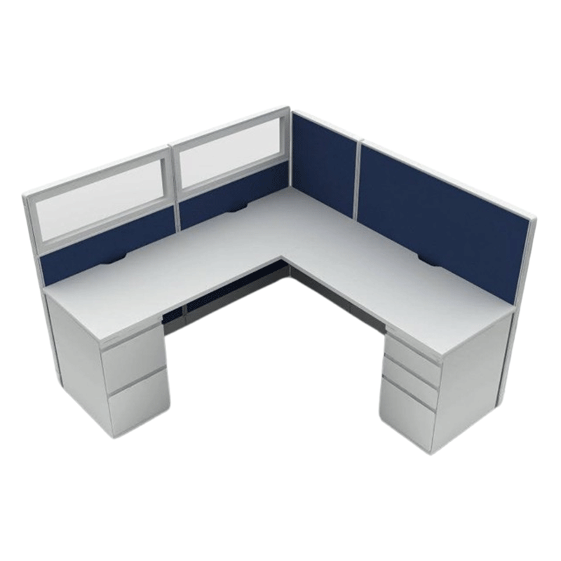 54” high 6’ x 6’ two pod workstation with glass stackers, 24” deep worksurfaces, box/box/file and file/file pedestals