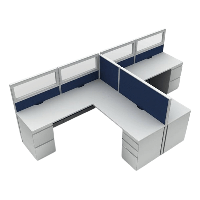 54” high 6’ x 6’ four pod single row with glass stackers, 24” deep worksurfaces, box/box/file and file/file pedestals