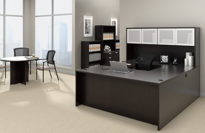 This is our budget friendly laminate desking line with many of our products in stock. We offer five contemporary finishes with accompanying seating, training room, and conference room options.